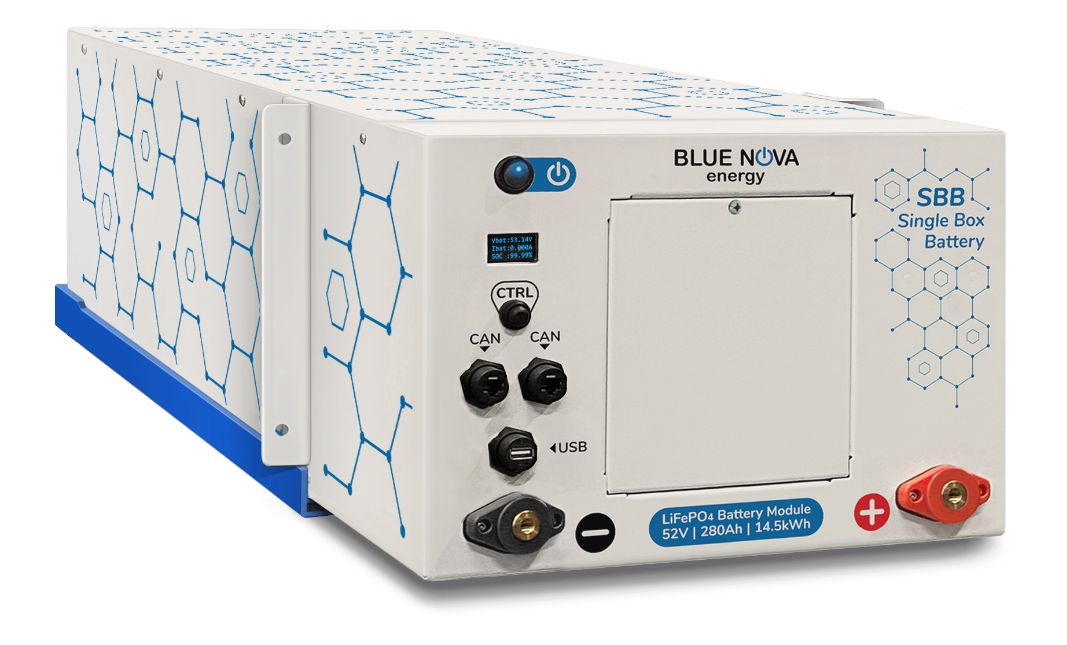 BlueNova’s BN52V-280-14.5k SBB™ battery modules offer flexible, high-performance energy storage, with 14.5kWh per unit and the ability to scale up to over 130kWh using parallel connections.